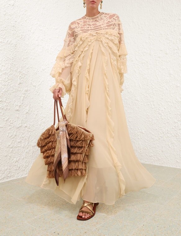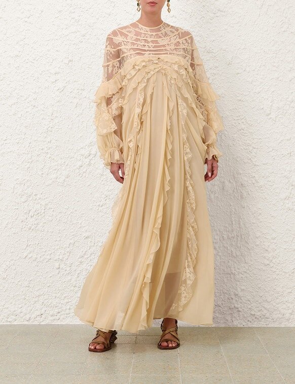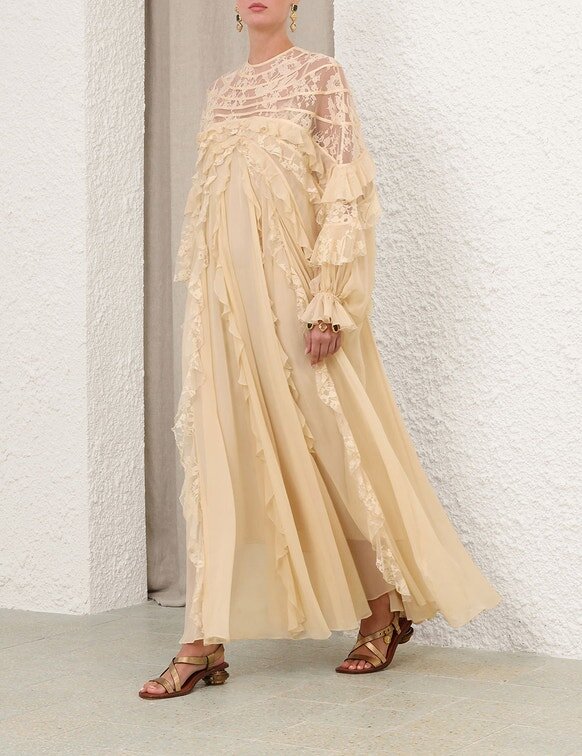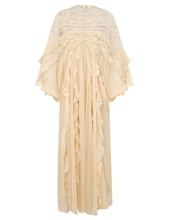 L’abito a balze con inserti Rebellion in color crema della nostra collezione Cruise 2026, Twisted Romance. Un maxi abito in seta con scollo rotondo alto, inserti in pizzo trasparente, rifinito con volant a cascata su tutta la lunghezza e chiusura con cerniera invisibile sul centro della schiena.