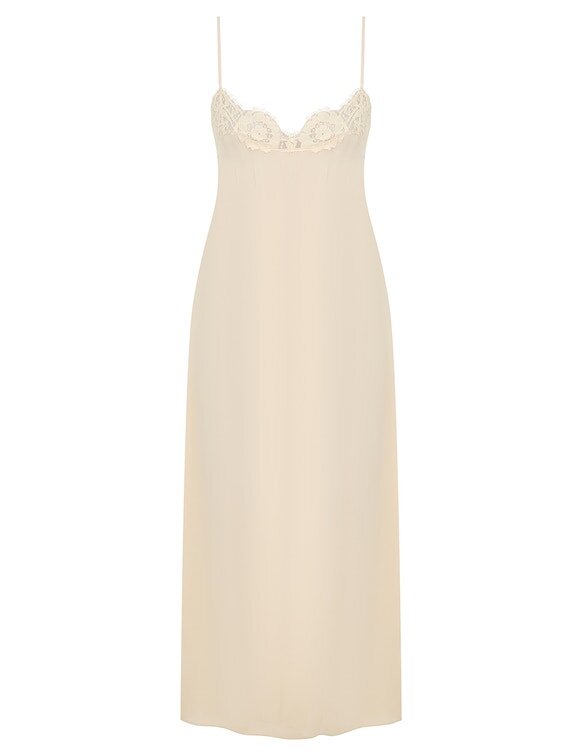 Tessuto principale: 100% seta; Pizzo: 60% poliammide, 40% cotone; Sottoveste: 100% viscosaTessuto principale: Lavare solo a secco con codice F (solo idrocarburi);Rimuovere eventuali decorazioni staccabili prima del lavaggio a secco;Coprire per proteggere le decorazioni;Stirare a bassa temperatura con un panno protettivo;Utilizzare solo vapore leggero;Non pulire localmenteSottoveste: Lavare a mano separatamente in acqua fredda con un detergente delicato;Non candeggiare;Asciugare all’ombra;Stirare a bassa temperatura con un panno protettivo;Non asciugare in asciugatrice;Lavabile a secco codice F (solo idrocarburi);Controllare sempre l’etichetta o la scheda di cura per istruzioni specifiche.