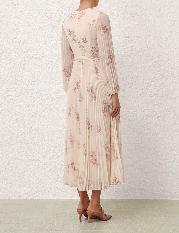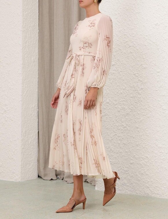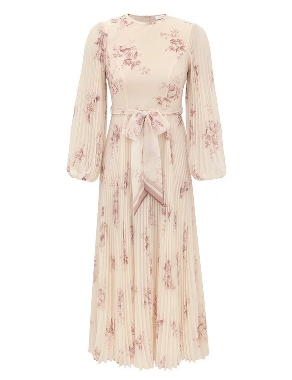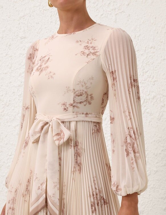 L’abito a maniche lunghe Sunray in crema a fiori della nostra collezione Primavera 2026, Kindred Spirit. Un abito a maniche lunghe con scollo rotondo, cintura in vita rimovibile e maniche lunghe a raggi di sole, rifinito con una gonna in stile plissettato.