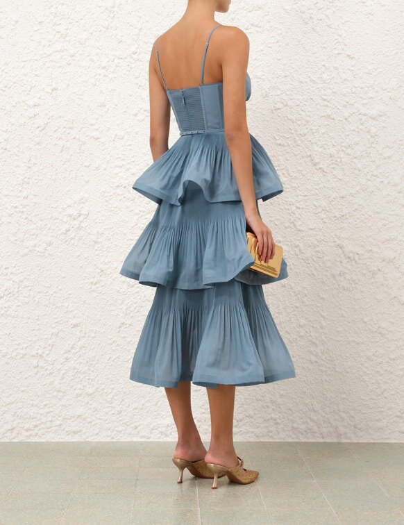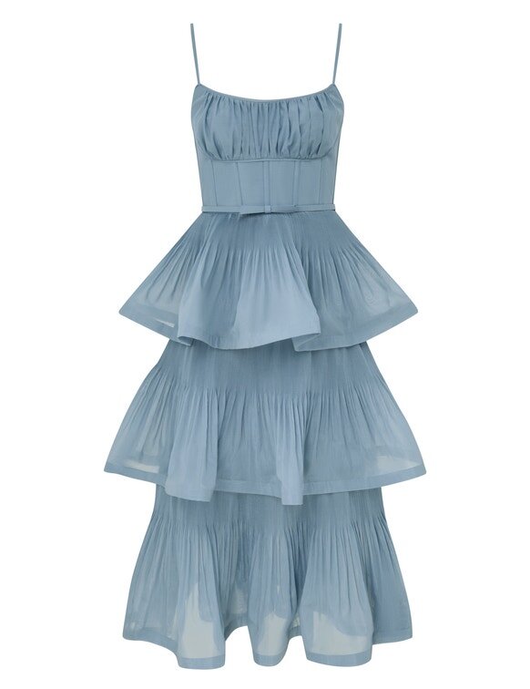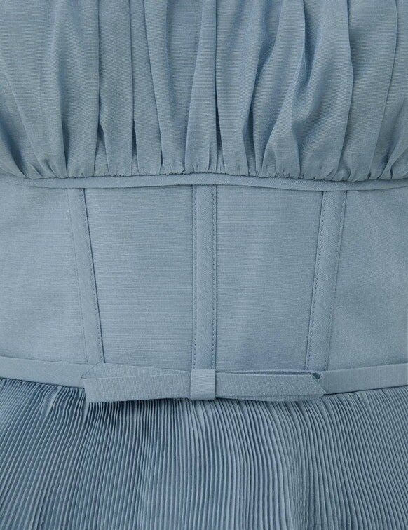L’abito midi a balze plissettato in blu intenso della nostra collezione Cruise 2026, Twisted Romance. Un abito di lunghezza media caratterizzato da scollo rotondo, spalline regolabili, rifinito con corpetto a corsetto e balze plissettate su tutta la lunghezza.