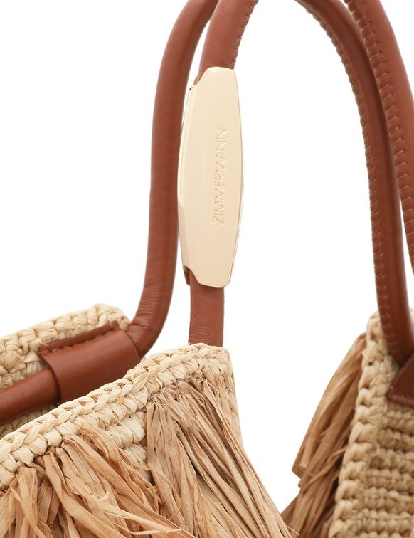 Tessuta a mano in rafia, Goldentime è la compagna estiva perfetta: la sua silhouette si ispira all’universo del surf e alle forme organiche del paesaggio marino, mentre il suo manico tubolare infinito è adornato da dettagli metallici ispirati alle tavole da surf. Dotata di una tracolla aggiuntiva e rifinita con frange giocose in rafia naturale tagliate a mano, Goldentime può contenere tutti gli essenziali estivi per passare senza sforzo dalla spiaggia alla città.